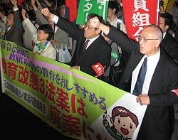 全教と教組共闘、子ども全国センター、憲法・教育基本法全国ネットワークは、国会会期末も間近に迫った6月19日、教育改悪3法案の廃案を勝ち取ろうと6・19中央行動を実施。11時からの国会前座り込みを開始…