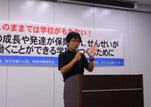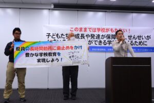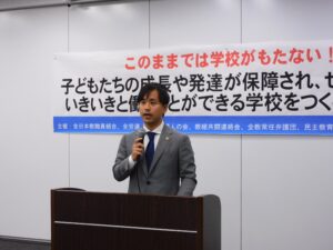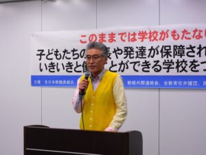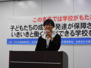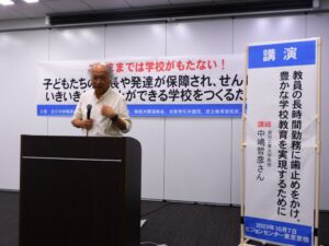 集会では、はじめに「教員の長時間勤務に歯止めをかけ、豊かな学校教育を実現するための全国署名」の発起人でもある教育研究者有志の中の中嶋哲彦さんが講演を行い、給特法を抜本改正し、長時間労働の抑制につながる教員に残業代を支給するしくみをつくること、そして教員の授業の持ちコマ数の上限を定めるための義務標準法の改正の必要性が語られました。