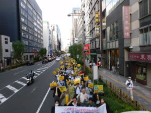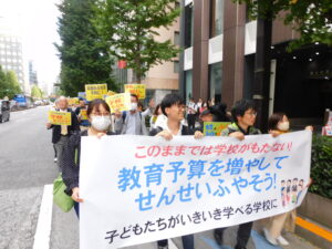集会後の銀座サウンドパレードでは、参加者全員がプラカードを掲げながら、ラップ調のコールや英語によるアナウンスも織りまぜながら、銀座で買い物を楽しむ市民のみなさんに、「このままでは学校がもたない、教育予算を増やして、せんせいふやそう!」の願いをアピールしました。