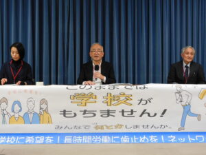 12月13日、「学校に希望を!長時間労働に歯止めを!ネットワーク」(略称:働き方ネット)を、全日本教職員組合、新日本婦人の会、全日本退職教職員連絡協議会、教組共闘連絡会で結成し、記者発表しました。