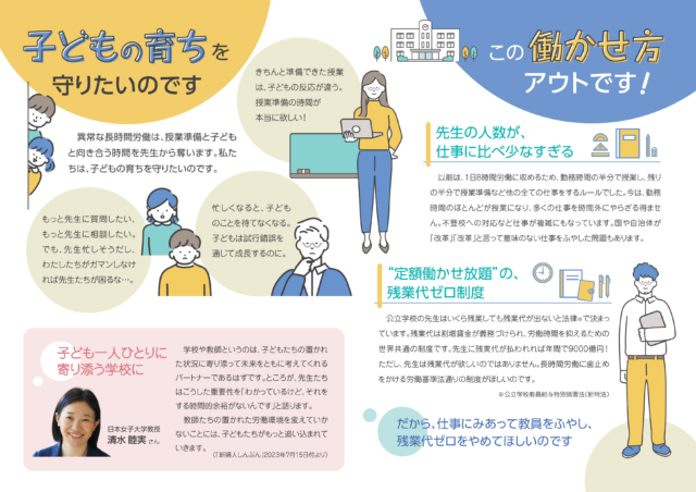 「授業準備ができないため、分からない子どもがふえる」「子どものことを持つことができず、豊かな成長が支えられない」⎯⎯教員の長時間労働は、子どもたちの育ちを日々危うくしているからです。