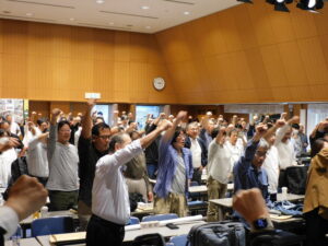 全教の当面する闘争と当面の共済運動の推進についての提案を受けて、活発な討論が交わされました。教育大運動1741にかかわって、給食無償化の前進や、学校統廃合をくい止めた共同のとりくみや、教研集会で教育学を学ぶ学生と教職の魅力について語る座談会を企画したとりくみなどが語られました。また、この学園で長く働き続けたいと要求を掲げて組合員を増やし理事者との交渉に臨み、賃金カット提案を棚上げさせた私学のとりくみ、職場のすべての人に声をかけ組合加入をすすめたとりくみなど、組織拡大の経験が交流されました。本格化する確定交渉にむけて、人事委員会に不利益変更を勧告させなかったという、とりくみの成果も語られました。全国一斉定時アクションについては各組織で積極的に議論され、工夫したとりくみが準備されていることが討論で明らかになりました。全国の職場から、組合員が起点となり、中教審答申ではなく全教の7つの提言の具体化こそこのままでは学校がもたないという危機を打開できることを社会にアピールするとともに、このとりくみを通じて組織の強化や新たな組合員を迎える可能性も大いに語られました。また、日本被団協へのノーベル平和賞にかかわる発言では、個人の尊重をつらぬき、戦争のない平和な社会を実現するジェンダー平等の重要性についても語られました。議案とあわせて全教ジェンダー平等宣言、総選挙に向けた特別決議、中央委員会アピールも採択されました。