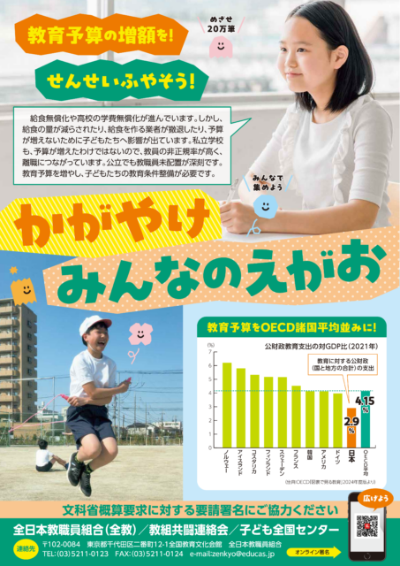 「えがお署名」は、貧困と格差の拡大から子どもたちを守り、「お金の心配をしないで学校に通えるようにしてほしい」という子ども・青年の声にこたえ、安全・安心な学校施設の整備や被災地の復旧・復興など、各地に広がるたくさんの願いと要求を実現するためにも重要なとりくみです。20万筆を目指してとりくみます。「教育予算を増やして!」のみんなの声を、署名に寄せてください!