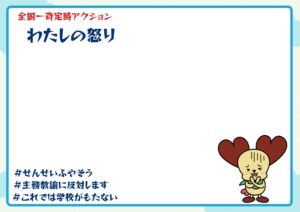 2025年4月16日に第3回全国一斉定時アクションを行います。通常国会で給特法改定案の審議が始まり、教育現場の願いを訴え、国会審議に影響を及ぼすため、第3弾「全国一斉定時アクション」にとりくみます。退勤時刻にあわせて、分会会議、街頭宣伝などを行うとともに、SNSデモへの参加を呼びかけます。