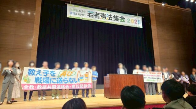 京都より代表スピーチをおこないました。「6年生の社会は最初の単元が憲法。堂々と学級に憲法を生かすことができます。学級経営で困ったら、憲法を基に考えればいいと組合で学びました。今、一番好きな条文は13条。『すべて国民は個人として尊重される』。学級の子どもたちは、本当に『個人』として尊重されているだろうか、時々自分の実践を振り返り、個人の尊重に立ち返ります。自民党草案のように個人の『個』を抜いてはだめなのです。この『個』があることによって、本当に一人一人が大事にされるのだと思います。」と、力強く語られました。全国から参加した青年教職員がともに壇上に並び、「教え子を再び戦場に送るな」の横断幕を掲げました。