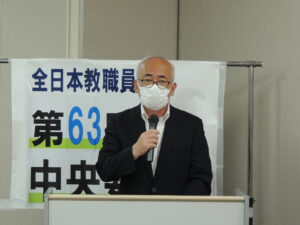 宮下直樹中央執行委員長は冒頭のあいさつで、コロナ禍のもと、2度目の夏を迎える子どもたちの声を聴き、父母・保護者、市民とともに語り合うことの必要性をまず指摘しました。そして、菅政権のコロナ対策があまりにも場当たり的でその場しのぎであると批判し、学校連携観戦を中止と、オリンピック・パラリンピックそのものを中止して感染対策に全力集中することを求めるとともに、7月4日の都議選、そして総選挙で教職員の要求実現する政治を実現させるために主権者として声を上げようと訴えました。そして2020年度のとりくみをふまえ、現場の願いをつかみ要求に練り上げること、要求を保護者・市民、関係者など広く共有すること、当事者がとりくめるような提起、情勢を機敏につかみ提起することが重要であるとして、そこに教職員組合の存在と役割があると強調しました。
