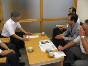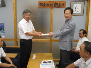 全教は、7月25日、全国の教職員からの義援金を長野県栄村教育委員会に届け、宮川幹雄教育長と懇談しました。懇談には、全教蟹澤昭三書記次長とともに長野高教組の高村裕委員長と教組共闘黒沢清一代表幹事が参加しました。