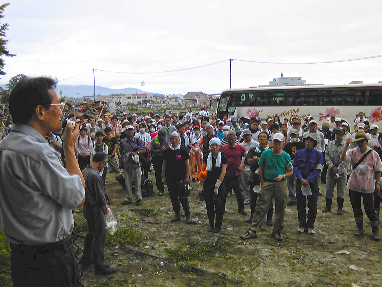 2日目からは、5台のバスなどに分乗し、住宅の泥だし、稲の苗箱洗い、仮設住宅へ野菜届けなどにとりくみました。アパートの泥だしに行った50人のグループは、床下にたまったままの泥を掻き出すために、床板をはがし、屈んで汚泥をすくい出すという臭いもきつい重労働に汗を流しました。大家さんからは、「救援が来なくて困っていた、助かりました」と感謝の言葉があり、近所からは「明日はうちも」と要望が出されました。県教組組合員の自宅の泥だしに行った10人のグループは、日本製紙の工場から流れ出た大量のパルプや紙屑が40~50㎝も積もった庭の泥をシャベルで掘り起こし、土嚢袋につめて外に運び出しました。住宅街でも、幹線道路から奥に入るとまで救援の手が届いていない地域があることも分かり、引き続く全国からの救援の必要を痛感しました。