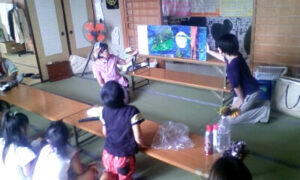 東松島市にある農家8軒が共同経営している会社から、全労連の現地支援共同センターに津波で泥をかぶった稲の苗箱を洗ってもらえないかと要望があり、全教・教組共闘から2日間でのべ130人が行って、泥まみれ、水浸しになりながら、汗だくで作業を続け、8千箱の洗浄作業をやりとげました。この会社の津波による被害総額は1億2千万円でしたが、捨てようかと思っていた苗箱が使えるようになり800万円分を取り戻せたと喜ばれました。ここには、県教組石巻支部委員長の渡辺さんに来ていただき、近くにある被災した浜市小学校の校舎や体育館の中に入って視察し、子どもたちのようすを伺いました。翌日には、近くの避難所となっている公民館に組合員が出向いて紙芝居などを行い、子どもたちに大変喜ばれました。