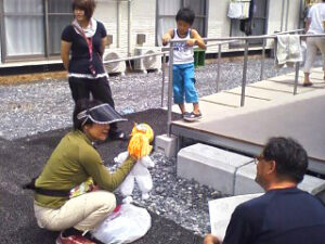 仮設住宅には、3日目に、100人がバス2台と神障教組のマイクロバスに分乗し、野菜などを届けました。全国のカンパから農民連に注文して届けてもらったジャガイモ、玉ねぎ、キュウリ、枝豆は、前日、神障教組からの参加者23人の団結の力でたちどころにより360袋に小分けされ、バスに積み込まれました。石巻市郊外にある最大の仮設住宅トゥモロータウンでは、55人の参加者が組をつくって210世帯に野菜を届け要望を聞くとともに、小さな公園では、ギターと歌で住民の方も集まり、生活用品を広げ、子どもたちに風船をあげるなど喜ばれました。入居者からは「近くに店がない」「公共機関がない」「自動車も流され移動の手段がない」「住宅のまわりの草刈をしてほしい」「物資の配達は、震災直後は多かったけれど、最近はあまりない」という声がきかれ、今後の息の長い活動の必要を感じました。