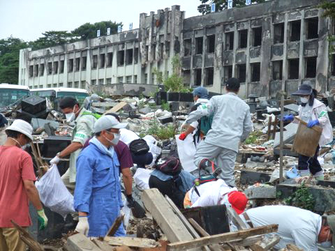 全教・教組共闘連絡会の第3次ボランティアは、8月3日から5日の日程で石巻市で行われ、これまで最大の255人が参加し、がれき処理、住宅の泥出し、稲の苗箱洗い、仮設住宅への野菜のお届け、避難所への激励にとりくむとともに、宮城県の高教組・県教組の役員や地元の方から子どもと教職員の被災状況、学校と地域の復興の課題などを聞き交流を深めるなど、大きな成果をもって終了しました。