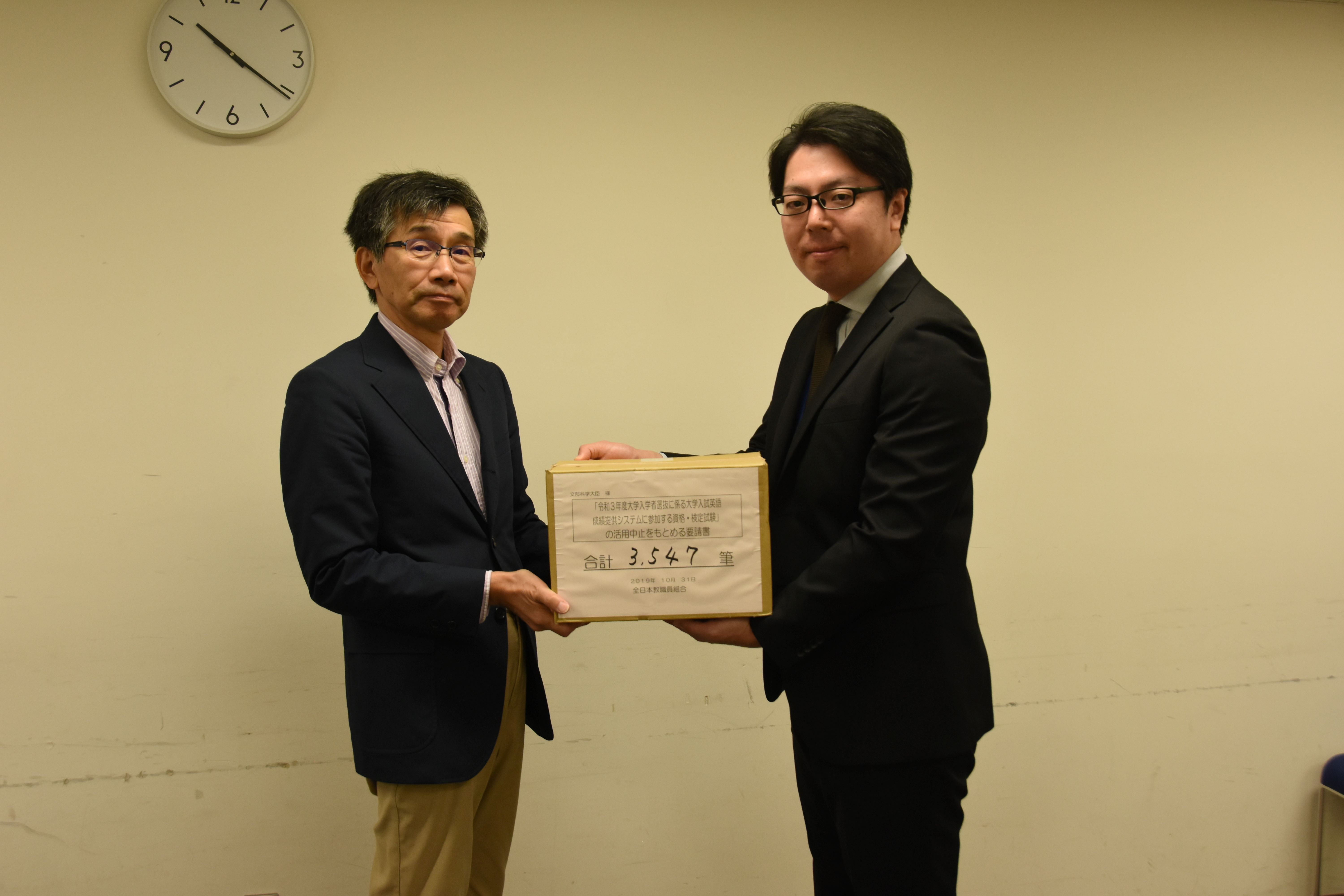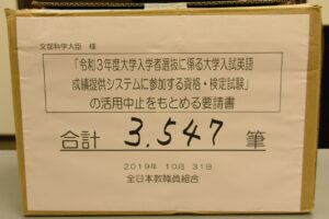 全教は、9月中旬以降、2021年度大学入試における英語民間検定の利用中止を求める署名にとりくみ、10月30日までに集約(=第1次集約)された3547筆を文科省に提出しました。