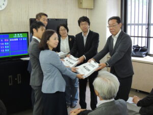 忙しい中駆け付けてくださった4人の国会議員より、それぞれ法案提出を断念させるために国会内外で連帯してたたかう決意がのべられ、集会参加者から「公立学校に『1年単位の変形労働時間制』を導入しないよう求める署名」は9158筆分が手渡されました。