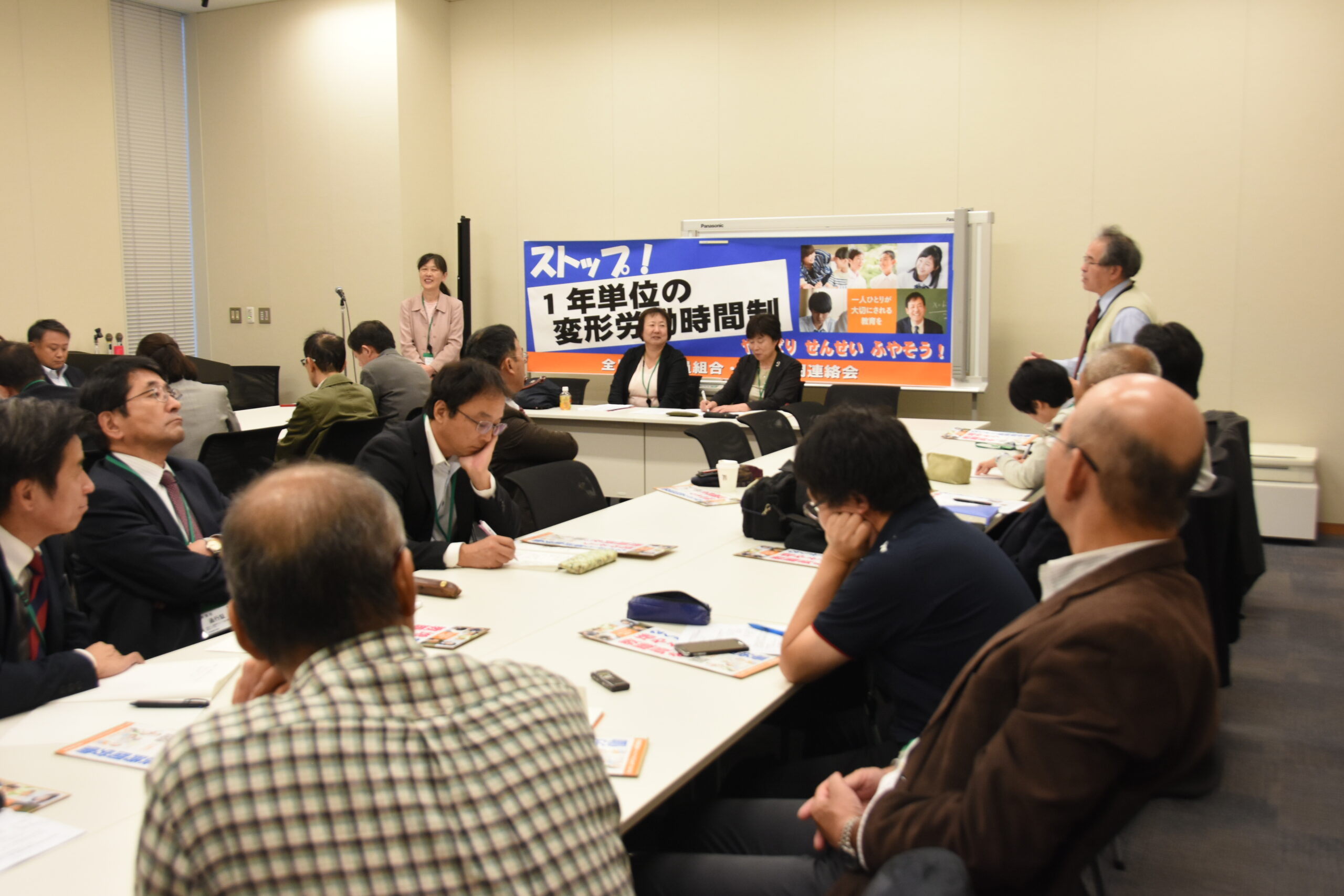 議員要請後のまとめの集会では、斎藤園生弁護士から、改めて法案の問題点をわかり易く指摘していただき、時間外労働の実態を覆い隠す「1年単位の変形労働時間制」の中身を、学校現場や国民の中へ急速に広げていくことを、参加者全員で誓いあいました。