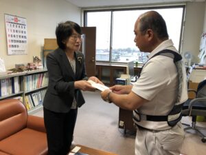 むかわ町教育委員会では、長谷川孝雄教育長などに対応していただきました。カンパの目録を受け取った教育長は、学校の被害状況や復旧に努めている様子を説明しました。教職員の大変な状況も語りながら前向きに復旧に向けてとりくむ思いを話されました。また、「子どもと学校の救援カンパ」という趣旨をいかして子どもたちのために使いたいと伝えてくれました。