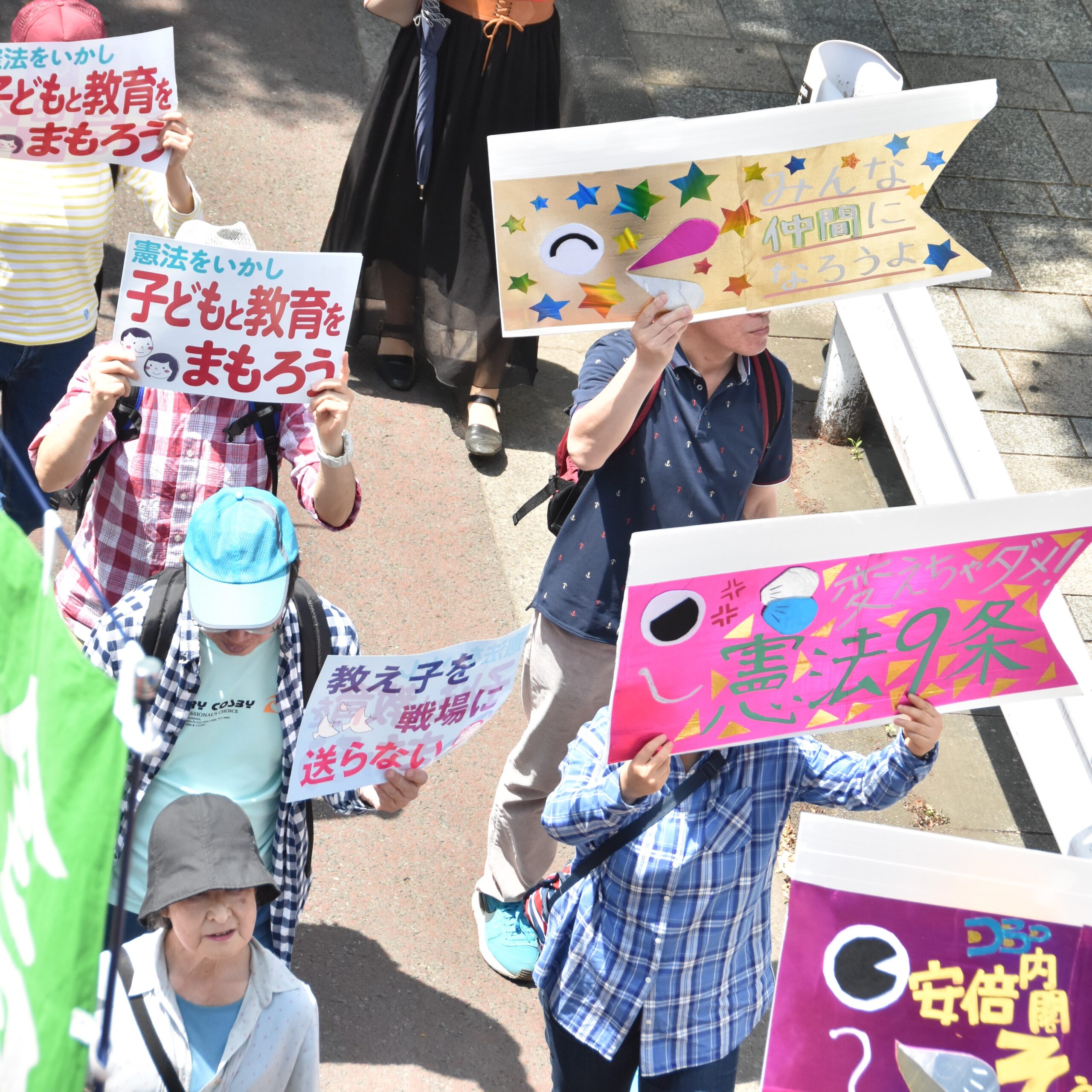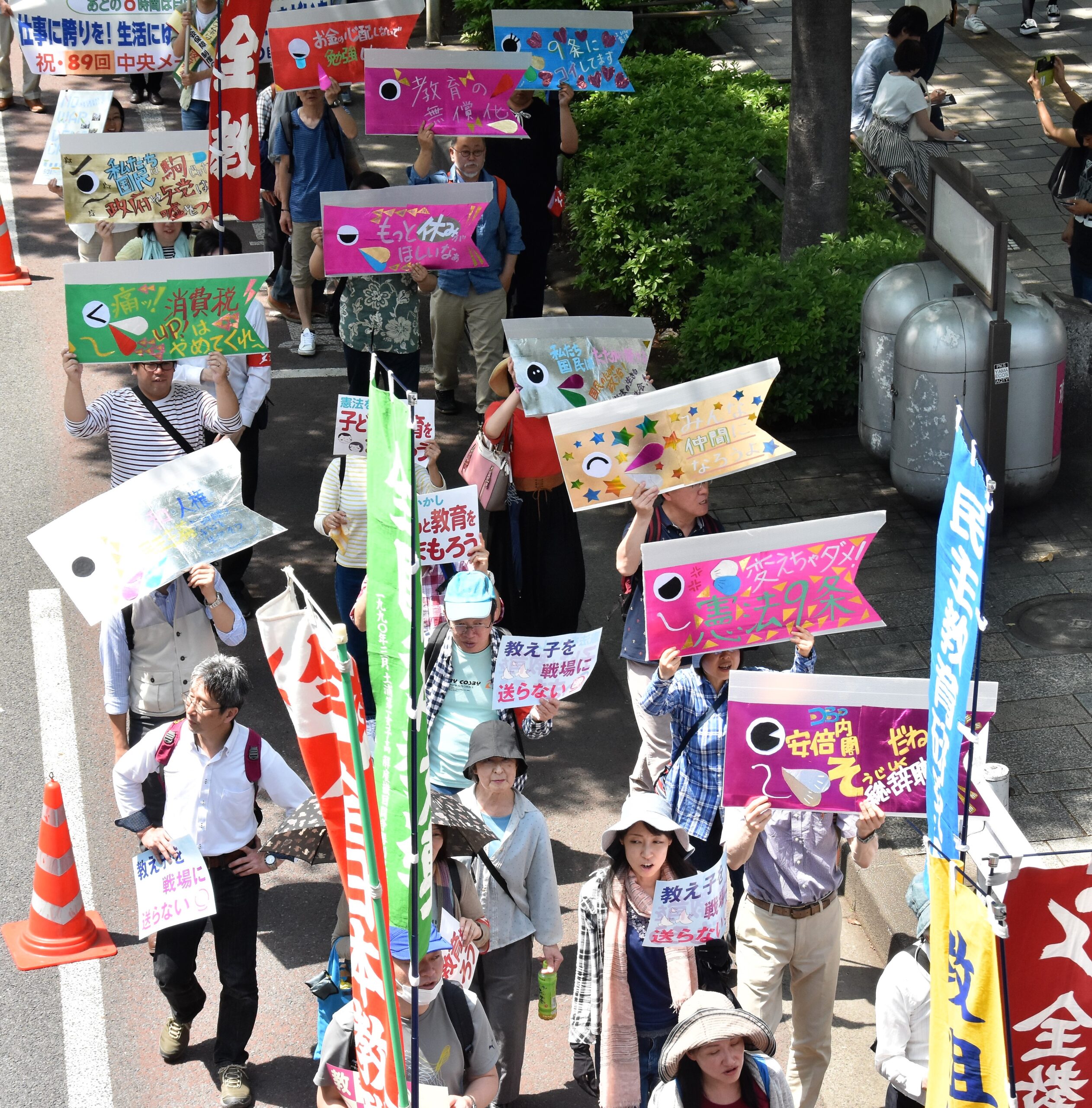 5月1日、五月晴れの青空のもと、第89回中央メーデーが開催されました。「9条改憲反対! 戦争法廃止 安倍政権の退陣を」「なくせ貧困・格差 8時間働けば暮らせる社会を!」「辺野古新基地建設阻止」などメインスローガンが掲げられた代々木公園には、2万8000人の働く仲間が集まりました。全教は、「変えちゃダメ!憲法9条」「教育の無償化を」など、思い思いの要求をこいのぼりに託してパレードに参加しました。