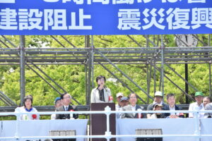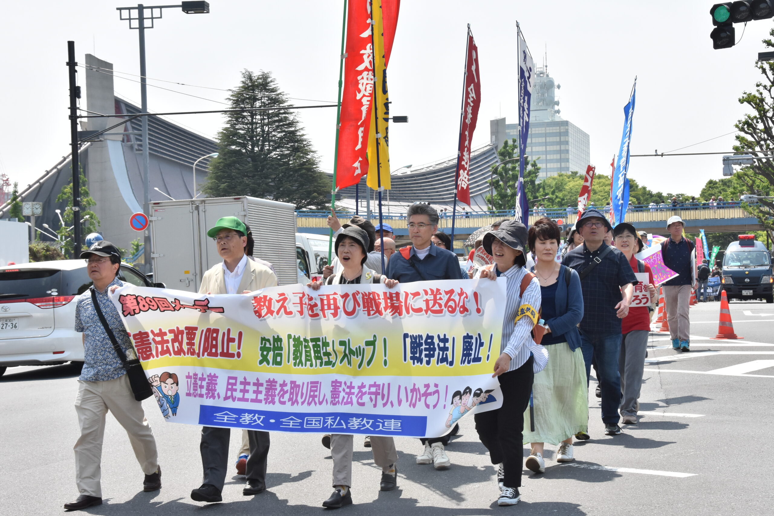 集会では、小田川全労連議長のあいさつ、九条の会などからの連帯あいさつにつづいて、3団体から決意表明がありました。決意表明に立った全教の小畑書記長は、「憲法9条改悪につきすすむ政権がすすめる教育政策に抗して、教育の条理に立った学校づくりをすすめていくことこそが、憲法を生かす道」と訴えました。