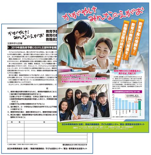 自民党が憲法「改正」の一環として「教育の無償化」を検討していると報道されていますが、その眼目は“低所得世帯の支援”です。私たちは、憲法に明記された「教育の機会均等」を保障し、権利としての教育の無償化を実現することを求めます。私たちの運動で大きな社会問題に押し上げた、教職員の長時間過密労働の問題を解決するためには、教職員定数の抜本的改善が不可欠です。