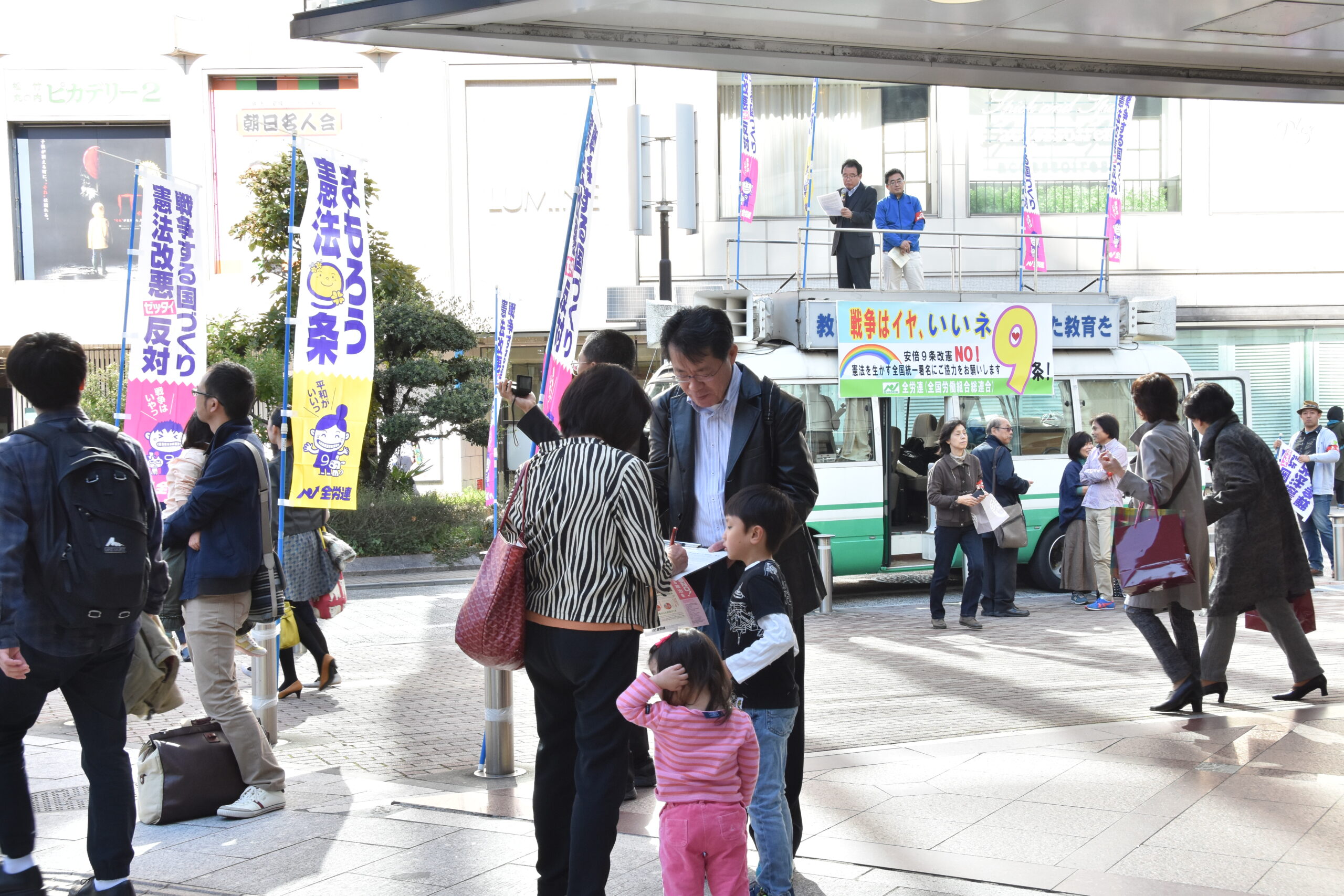 11・3国会包囲大行動に先立って、全労連の呼びかけにより都内各地で、大宣伝行動がおこなわれました。全教は、有楽町マリオン前で「憲法3000万署名」にもとりくみ、1時間で50筆以上を集めました。
