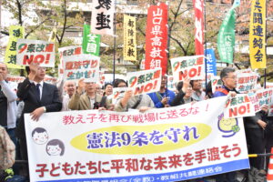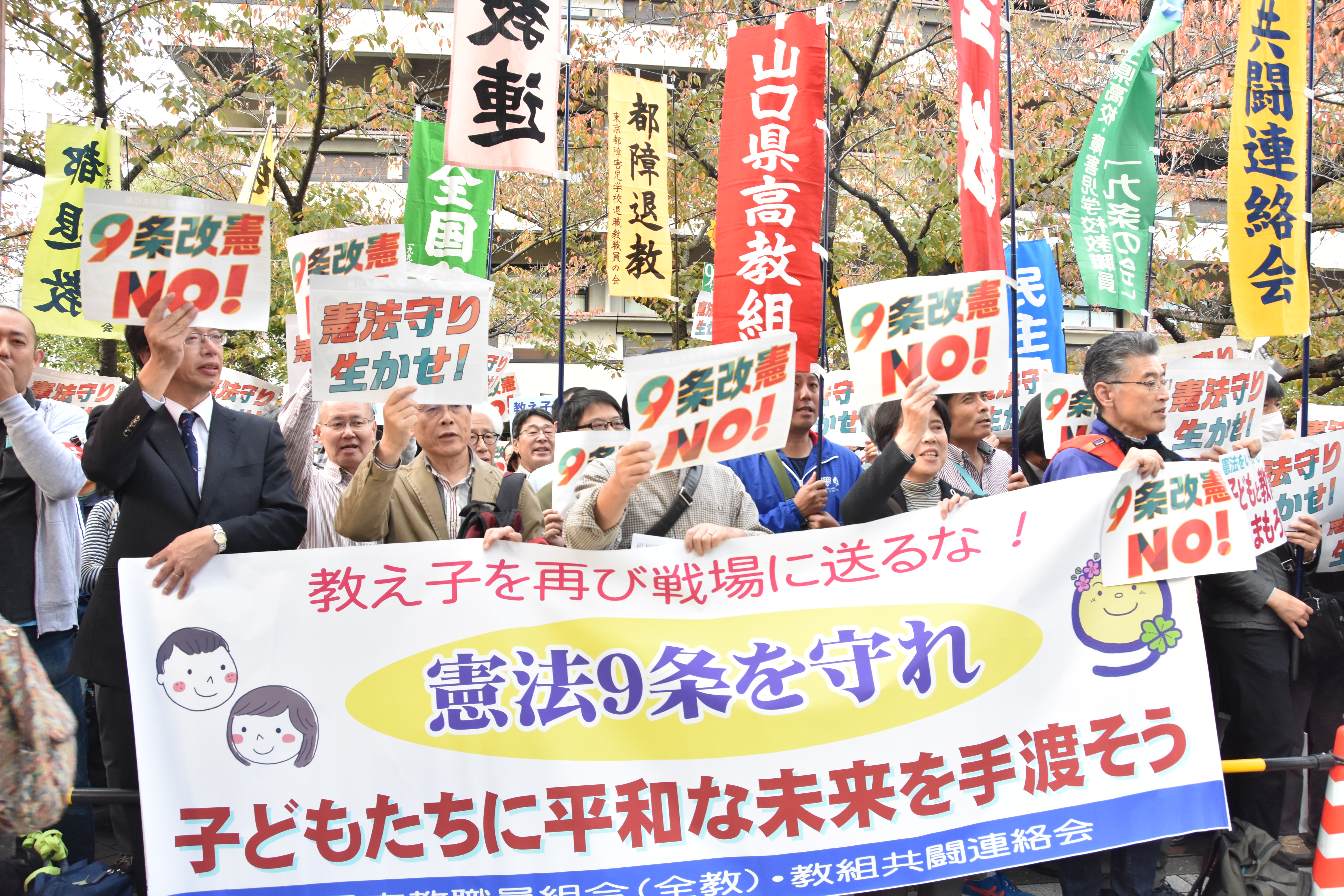 安倍政権のもとでの9条改憲に反対する行動が11月3日、全国各地でとりくまれました。安倍9条改憲NO!全国市民アクションの主催でおこなわれた11・3国会包囲大行動には、4万人が参加し、改憲に反対する国民の声を大きく上げる集会となりました。全教・教組共闘連絡会からは、350人以上の参加がありました。「9条改憲NO!」「子どもたちの未来のために9条守れ」のプラカードを手に、「教え子を再び戦場に送らない」という思いを込めて声を上げました。