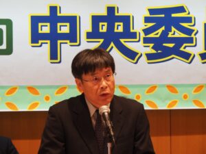 中央委員会の冒頭、中村尚史中央執行委員長があいさつし、臨時国会冒頭での乱暴で突然の解散を含めて、今回の解散総選挙にいたる経過そのものが、立憲主義を踏みにじり、国民主権をないがしろにするものであったと指摘しました。一方で、市民と野党の共闘をつぶそうとする逆流が起こる下でも、市民連合と3党での合意によって、5県で与党勢力を上回るなど、憲法にもとづく政治の実現に向けて前進する道を切り拓くものとなったと述べました。こうした情勢のもとで、憲法3000万署名の推進、全教を強く大きくするとりくみとしての「組織拡大3か年計画」最終年の成功を呼びかけました。