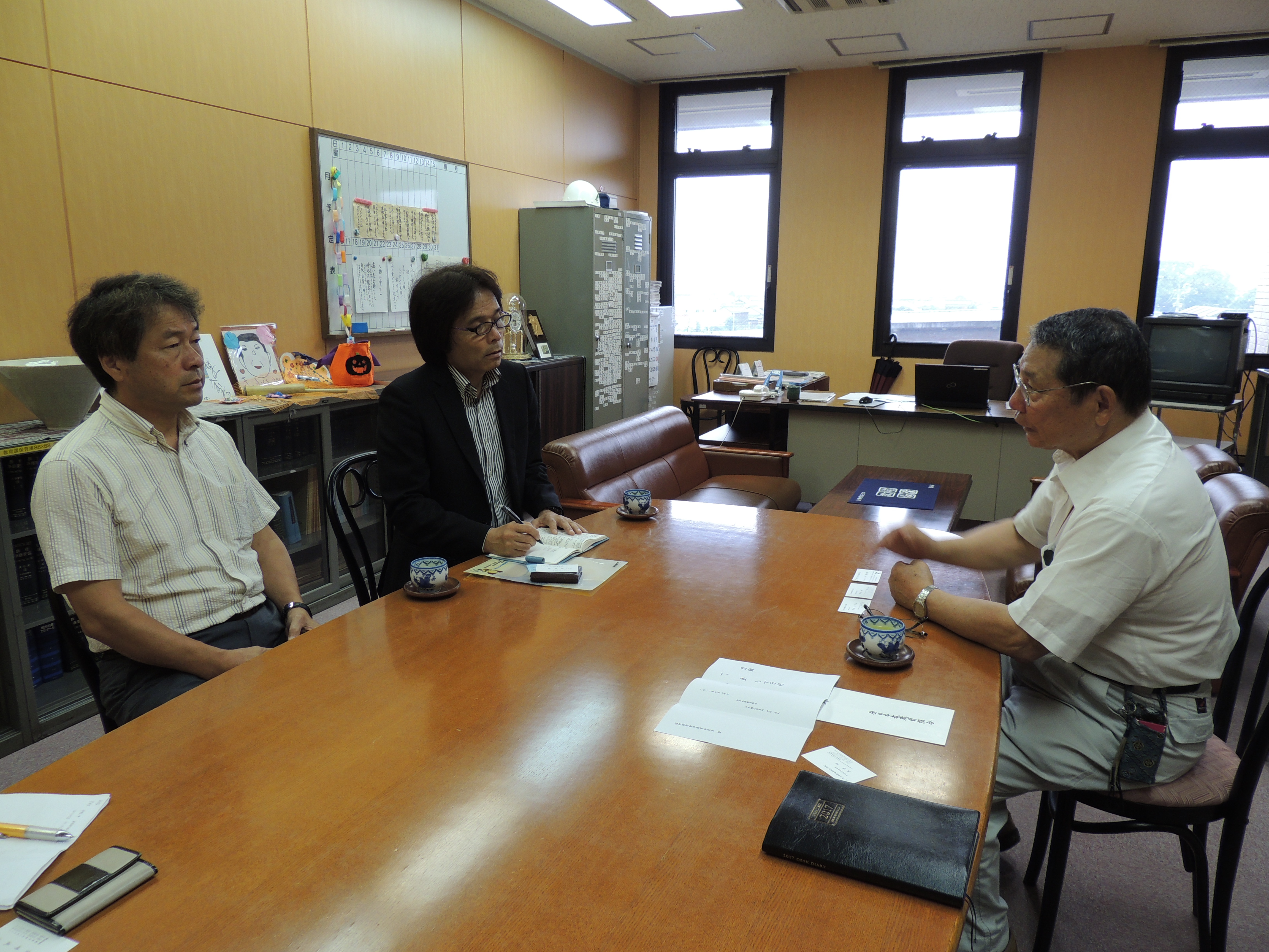 福岡県朝倉市では、宮崎成光教育長などに対応していただきました。土方副委員長からカンパの目録を受け取った宮崎教育長は、学校や子どもたちの豪雨災害の被害状況を説明しました。杷木地区の2校の小学校が、現在使用できない状況のため、仮設の校舎を建てて授業を再開している状況を語りました。スクールバスなどを使って、子どもたちが学校に通うことができている様子を教えていただきました。