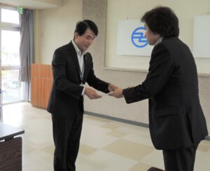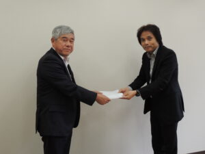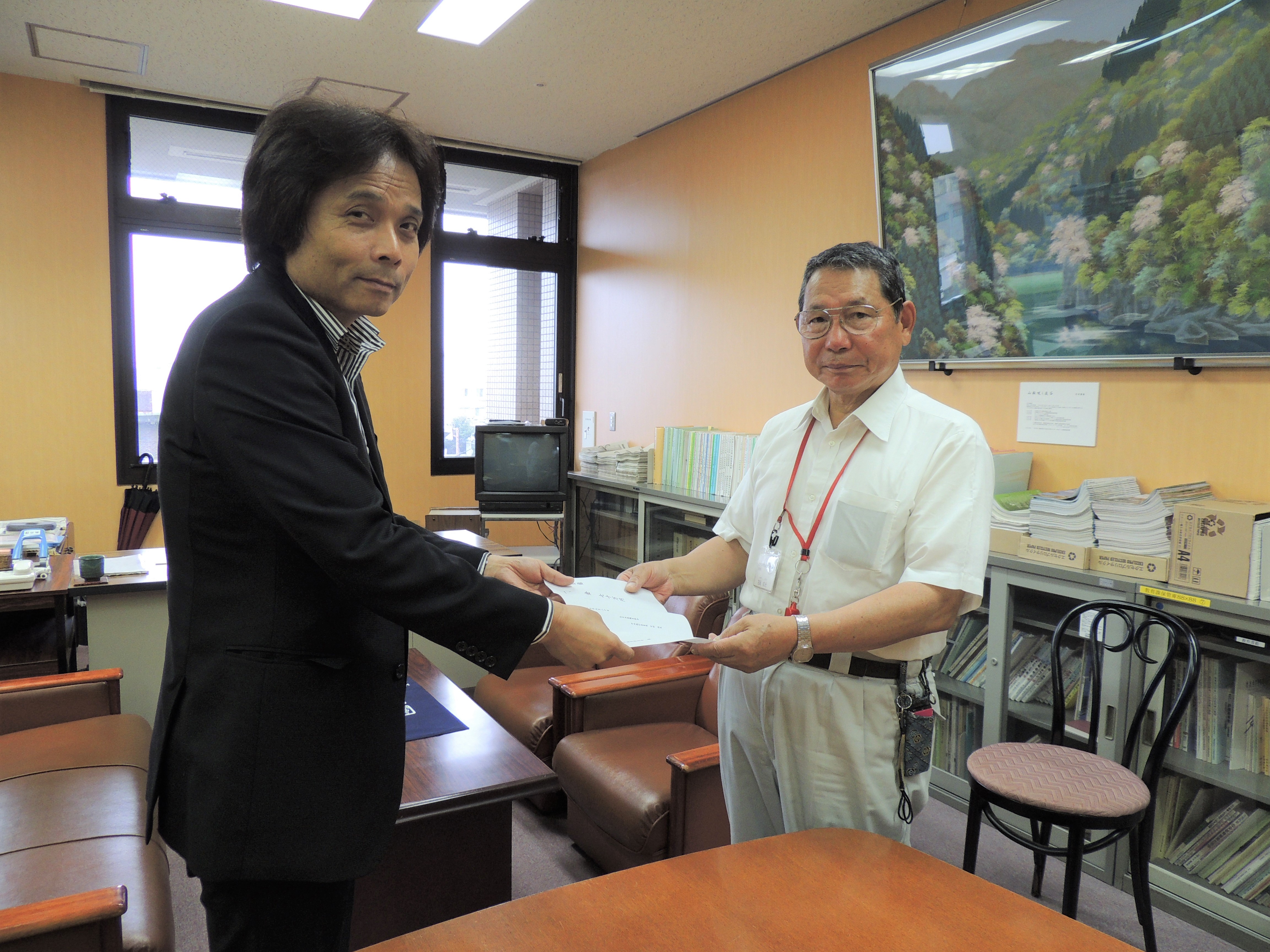 福岡県東峰村では、室井昭博教育長などに対応していただきました。土方副委員長からカンパの目録を受け取った室井教育長は、「子どもと学校のために救援カンパを使いたい」と豪雨災害の被害状況を説明しました。校舎へ直接的な被害はなかったが、プールに土砂が流れて、ボランティアの方の協力を得るなどして、プールの再開ができるようになった状況を語りました。