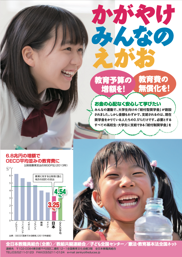 公財政教育支出の対GDP比をOECD諸国平均並みに引き上げることで、これらの課題を解決することができます。そのためにも、文部科学省概算要求にむけたとりくみは、きわめて重要です。教育共同組織や他の労組・市民団体にもよびかけ、共同の輪を大きく広げていきましょう。