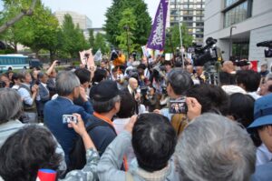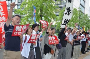 夕方に行われた木曜日定例の「戦争法案反対国会前集会」には、93歳になる作家の瀬戸内寂聴さんが参加し、「戦争を二度と繰り返してはならない」と述べました。集会中、マスコミなどの報道陣でごったがえし、集会が中断しました。寂聴さんは、「前の戦争がいかにひどくて大変かということを身にしみて感じている。しかし、最近の日本の状況は、怖い戦争にどんどん近づいているような気がする。『よい戦争』などない。すべて人殺し。若いみなさんが幸せになるように進んでほしい。その気持ちを、私が死ぬ前に伝えたいと思い、ここにやってきた」と訴えました。この日の参加者は2000人を超えました。
