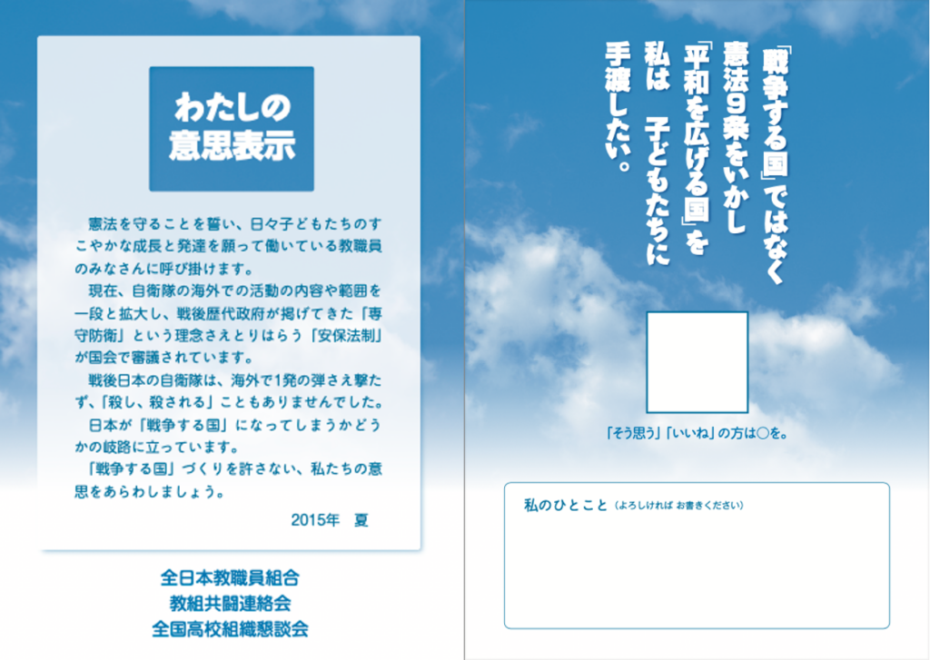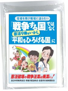全教は、職場・地域で「戦争法案」の内容を知らせ、成立を許さないとりくみを広げるためのグッズ、ポスター、チラシ、意思表示カード、ポケットティシュ、宣伝カーなどで活用する宣伝用音声データを作製しました。①ポスター