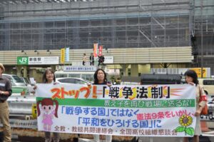 弁士としてマイクを握った全教の小畑雅子書記長は、憲法を壊す「戦争法案」反対への強い思いを胸に、「この『戦争法案』は、『教え子を再び戦場に送らない』と誓って、憲法、子どもの権利条約に基づく教育をすすめてきた私たち教職員にとって、どうしても許すことのできない法案です」と述べました。「憲法9条を壊し、日本を戦争する国に転換させる『戦争法案』の成立を許すわけにはいきません。憲法を守れ、『戦争をする国』ではなく、平和な未来を子どもたちに手渡そうと願うすべての皆さんと手をつなぎ、『戦争法案』廃案のために全力を挙げていきましょう」と訴えました。チラシを手にとってじっくり読む若者や、立ち止まって弁士の話に聴きいるお年寄りもいました。