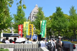 行動には全教本部、首都圏組織から多数かけつけました。都教組の木下雅英書記長は、「この行動に現場からかけつけた教職員がいる。安倍政権の暴走はあらゆる分野にわたる。先週も『戦争法制』阻止の行動、TPPや労働法制改悪の集会やデモがあった。都教組は首都圏の組織として、すべての行動に都教組の旗を掲げ参加する。「戦争法案」をここで許したら憲法を変えることと同じことになってしまう。「戦争法案」は絶対廃案に」と述べました。