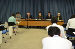 文部科学省記者クラブでの記者発表では、北村佳久全教中央執行委員長・子ども全国センター代表委員、小畑雅子全教中央執行委員・子ども全国センター事務局長、中村尚史全教中央執行副委員長・子ども全国センター幹事などが参加しました。