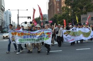 また、全国5ブロックの代表による、好きな条文と思いに寄せた「I LOBE 憲法メッセージ」のアピールや、沖縄、長野、大阪、宮城、東京の教職員と高校生によるレートーク、埼玉の教職員によるエイサー隊、全国で活躍する「おやじバンド」が一堂に会したライブ、都教組や都退教、歌声サークルなど約100人で結成された「3・29合唱団」の大合唱もありました。