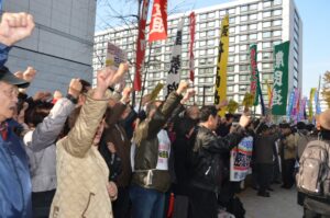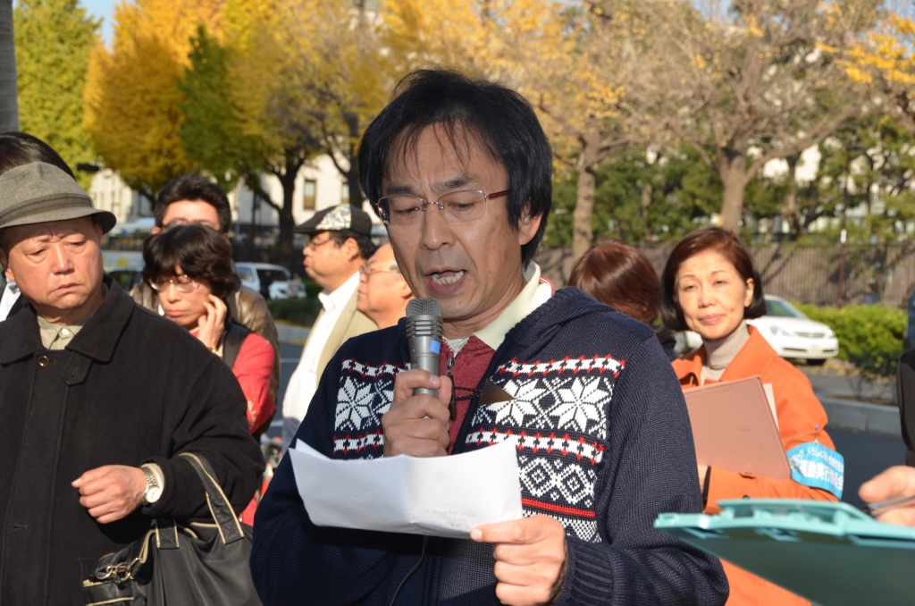 昼の「定例国会前行動」(大運動実行委員会などが主催)には1000人が参加しました。全教を代表して大教組の藤川真人書記次長が決意表明をし、「大阪では12月1日、『秘密保護法案を許さない』という一点で、御堂筋パレードをとりくんだ。『国は真実を隠すな』『秘密は戦争の始まり』『心を縛るな』などのプラカードを手に、町行く人に訴えた。反対の運動が一気に広がっている。廃案にむけてともにがんばろう」と訴えました。