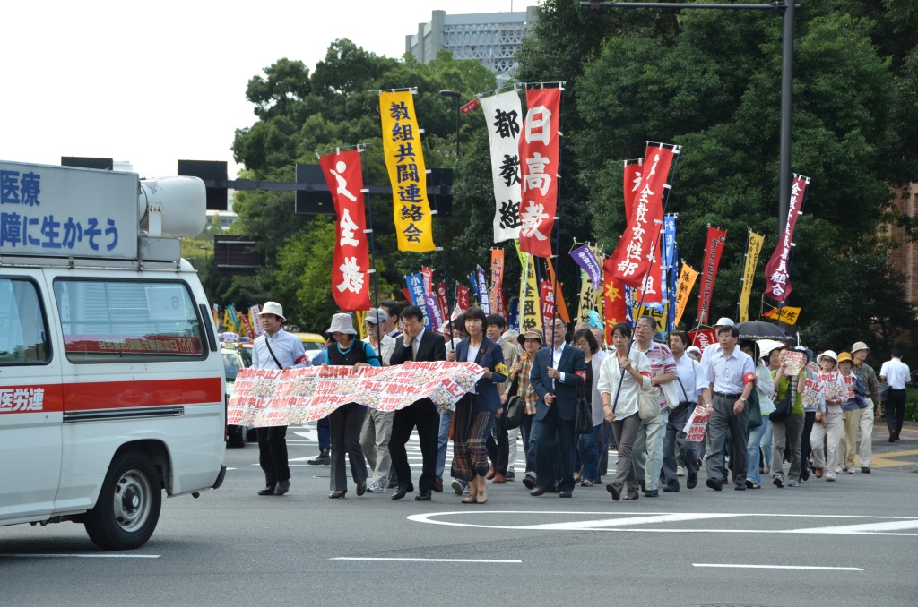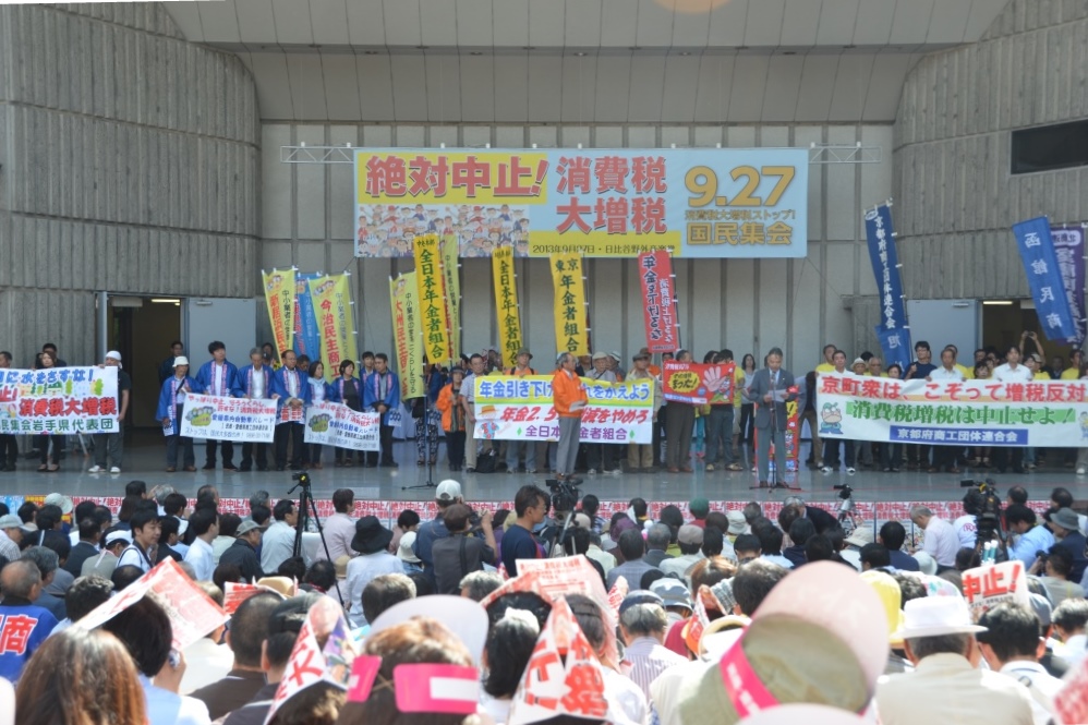 集会では、「低賃金で子どもを産むことすら躊躇している。増税で人間としての幸せを奪わないで」、「物価が上がり、介護保険は上がり、医療費も上がる。一方で年金は下がる。今後どうやって暮らせばいいのか」、「儲かっている大企業には減税をして、赤字の中小企業や子どもにも負担を強いる消費税は増税。どう考えてもおかしい」などが紹介され、「多くの国民は2014年4月の8%への大増税には反対です。『大増税は中止を』の声を全国津々浦々に広げ、消費税第増税をストップさせましょう」と訴えました。集会後、日比谷野音から銀座を通り、東京駅までパレードをしました。