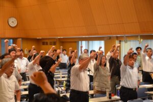 最後に、全教と日高教より、堺市長選挙にかかわる推薦書と寄せ書きが大教組と堺市教組に贈られ、北村委員長の「団結がんばろう」で閉会しました。