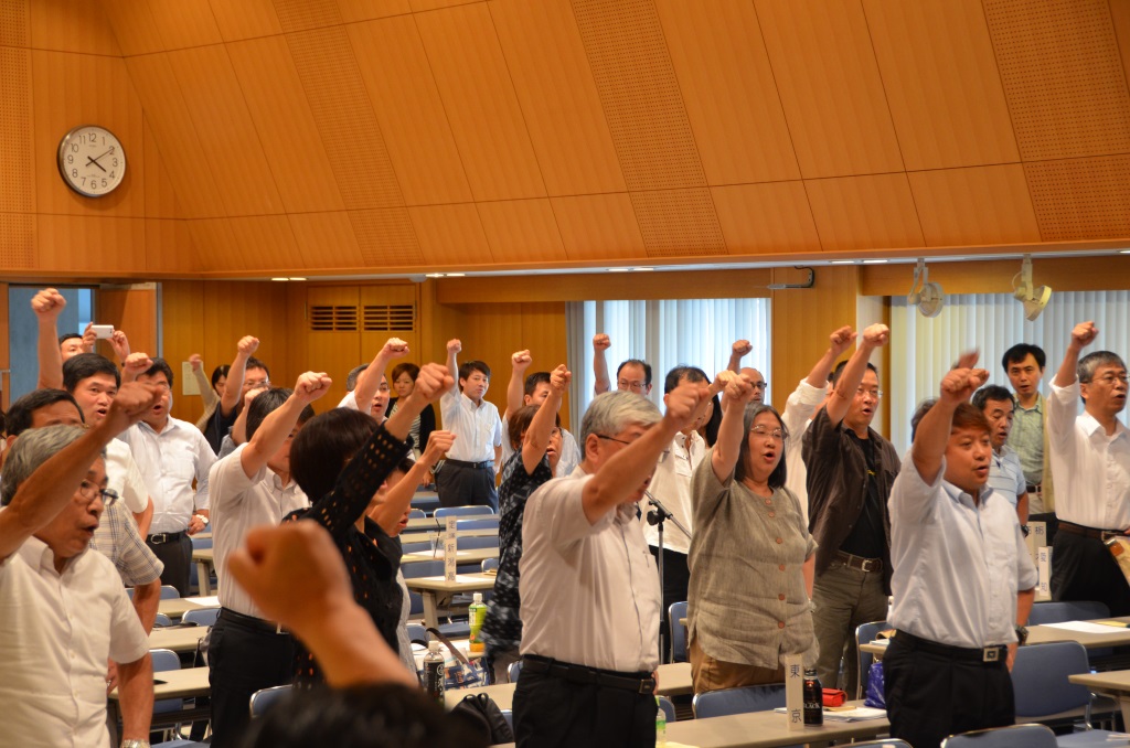 討論では、愛知から「教育のつどいのとりくみから、組合に複数の青年が加入し、青年部ができた」(愛教労)、「賃下げ反対の1万筆署名運動や職場でのとりくみが、分会の姿が見え、組合に対する期待が高まり、組合拡大も広がった。『がんばって』と言われ、『一緒にがんばろう』と声をかけたら組合に加入してくれた。声をかける方も気軽に大胆にかけるようになった」(埼玉高)、「知事が、学力テストで成績下位100校の校長名発表する動きがあった。中止に向け教育長に要請した」(静岡)、「高校授業料無償化に所得制限導入反対の声を文科省宛にFAXで送るとりくみをすすめている。要求活動は動かないとできない。」(私教連)、「9年連続給与独自カットの上に、賃下げが断行された。6者で共同の反対運動広がる」(香川)、「陸自あいば野演習場での日米合同演習でオスプレイが飛ぶ。『10/6オスプレイ来るな!大集会』を開催。ぜひ参加を」(滋賀)などの発言がありました。
