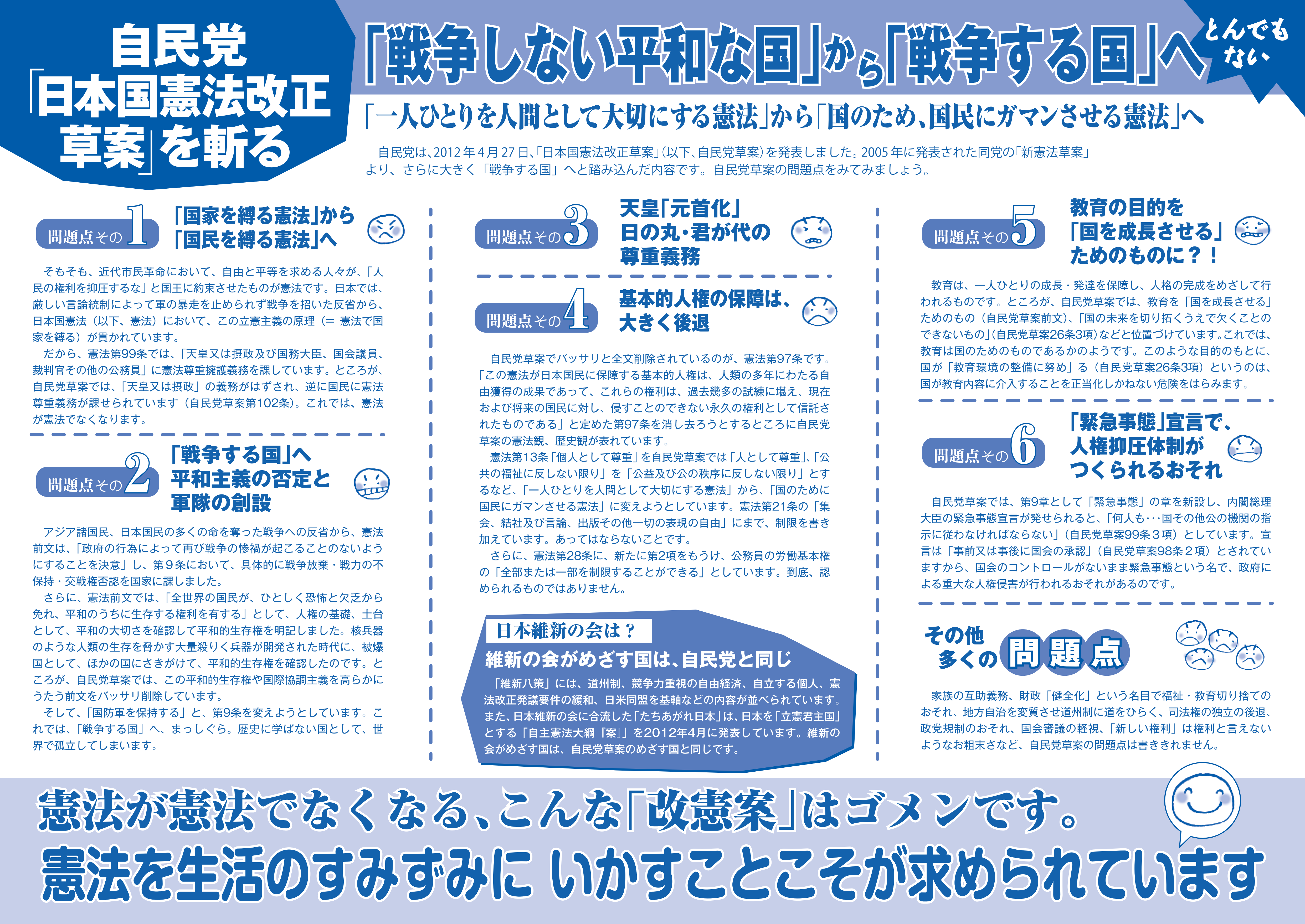 国会では、新しい勢力分野のもとで、自民党の動きに日本維新の会やみんなの党が呼応して、憲法96条改悪や、「集団的自衛権行使」容認に向けた策動が進められようとしています。改憲を許さず、憲法を守りいかす運動を急速に広げることが求められています。そのためにも、憲法の学習運動が必要です。