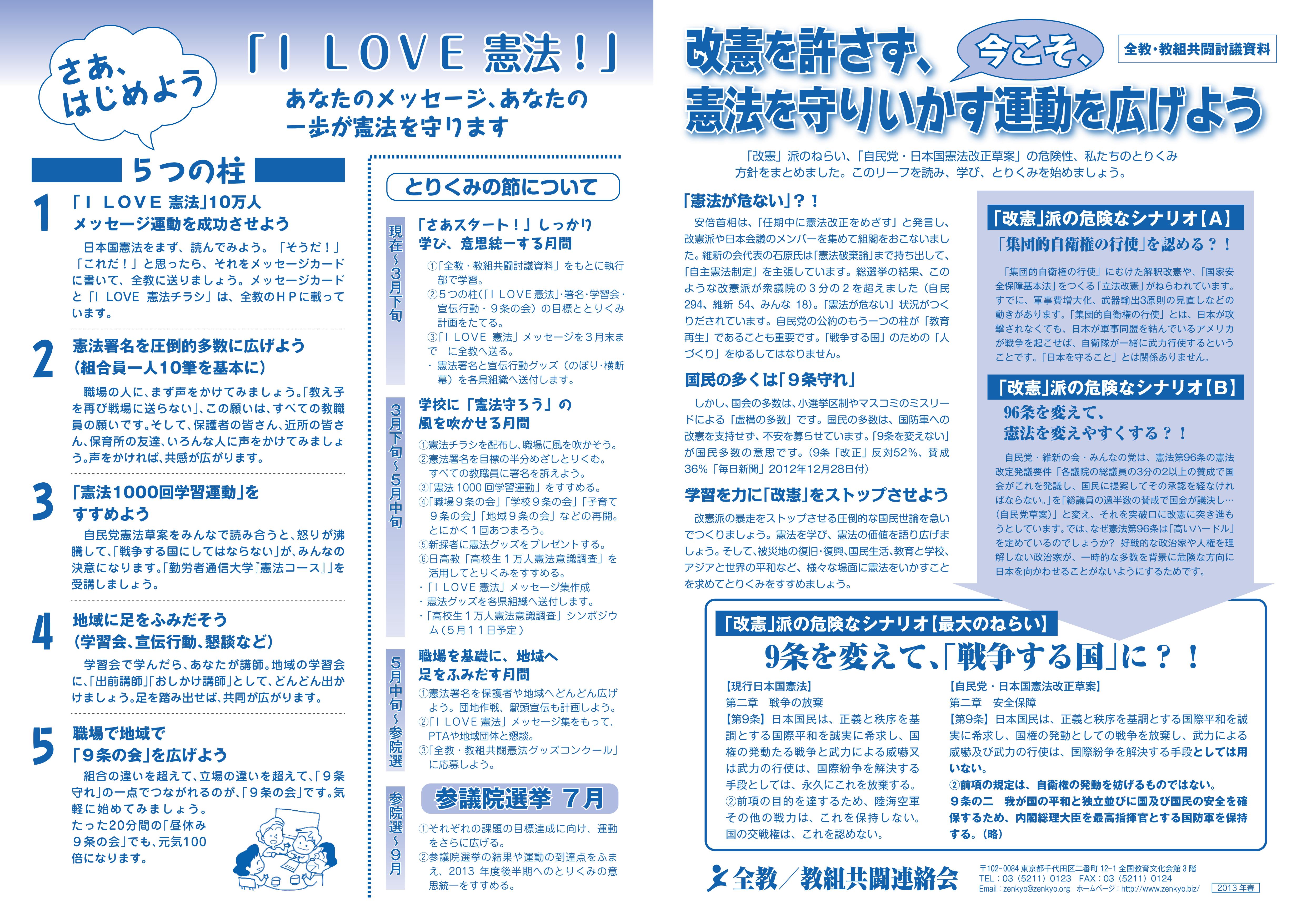全教・教組共闘は「憲法討議資料」を作成しました。この資料も活用し3月を「憲法闘争スタート! 意思統一期間」と位置付けて、とりくみを強めていきましょう。憲法討議資料中面憲法討議資料表面
