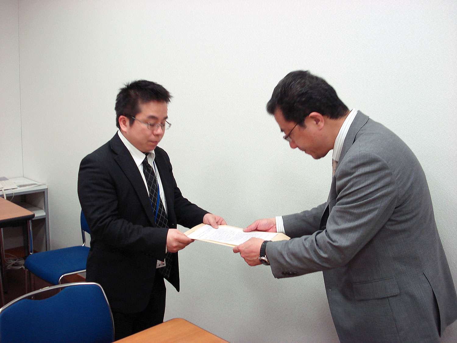 3月28日(水)午後、得丸浩一教文局長と中村尚史総務・財政局長が文科省に赴き、「武道必修化を押しつけないことを求める申し入れ」を提出しました。文科省からは初中局教育企画課調査係長が対応しました。