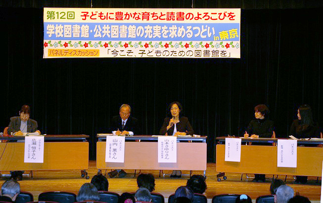 全体会では、広瀬恒子さん(親地連代表)をコーデイネーター にパネルディスカッション「今こそ、子どものための図書館を」が行われました。パネリストからは、学校に司書が配置されて子どもが集まる図書室に変わった、しかし学習指導要領の改定で図書の時間をとることが難しくなっている(小学校教員)、著作権法の改正ですべての障害児が本を読めるためのマルチメディアデージーなど書籍の「翻訳」を図書館や学校がおこなうことが可能となり必要となっている(公立図書館職員)、地元の区立図書館移転に反対して親が集まり区への陳情などにとりくみ、子どもの身近に読みたい本がある、手に取って子どもが選べる図書館があることの大切さを深く考えるようになった(新宿の若いお母さん)などの報告がありました。会場からの発言では、学校図書館と公共図書館の連携、保育園や幼稚園と図書館の連携などの必要が議論されました。