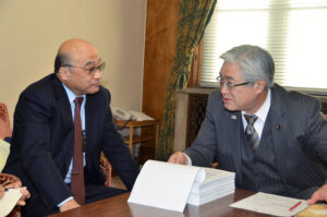 全教は、14日夜に各構成組織へ緊急要請書のとりくみを提起し、各都道府県組織や支部、分会から連日要請書のファックスが届き、日数のない中で21日10時までに731組織・団体となりました。要請書の綴りを受け取った池口議員は「(全教の申し入れ内容は)私たちと方向は同じ」「予算は通せても、法案は我が党だけでは通せないのが実情である」と回答しました。今谷書記長は改めて小学校2年生の35人学級実現と高校無償化の継続等を強く要請しました。