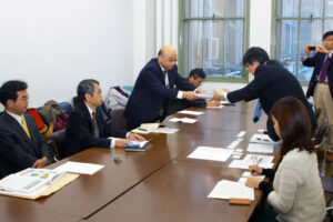 要請行動の中で、安住淳財務大臣あての緊急要請書294組織・団体分(16日14時までに届いた分)を提出し、少人数学級の前進や給付制奨学金などを2012年度政府予算に盛り込むよう要請しました。要請には、加門憲文副委員長、今谷賢二書記長、波岡知朗中央執行委員が参加し、財務省陳情窓口の吉盛和馬氏らが対応しました。
