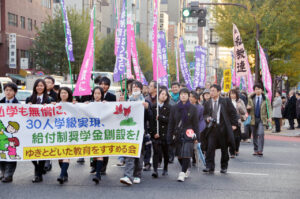 集会後、「教育費無償化」「30人学級実現」「私学も無償に」「給付制奨学金創設」などを訴えながら、靖国通りをパレードしました。