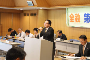 討論のまとめに立った今谷賢二書記長は、教育全国署名を軸にした秋の運動の推進、労働基本権回復を軸にした秋季年末闘争、地方確定闘争の前進、組織拡大の飛躍的前進を訴えました。