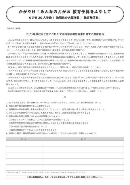 7月22日(金)の全労連公務部会・公務労組連絡会の中央行動の際に文科省に提出する予定です。