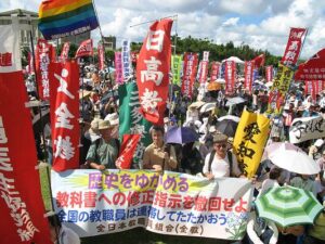 9月29日、文部科学省が高校歴史教科書の検定で沖縄戦「集団自決(強制集団死)」の記述を削除したことに抗議する「教科書検定意見撤回を求める県民大会」が宜野湾海浜公園で開催され、11万6000人(宮古、八重山での大会を含む)が参加。すべての国民と子どもたちの問題であるとの全教・日高教の呼びかけに応え、この大会に全国各地から組織の代表が参加し、沖縄に全教の旗をなびかせました。大会が大きく成功したことにより、検定意見撤回に向けた動きが始まっていますが、逆流を許さないためのとりくみ強化が求められています。