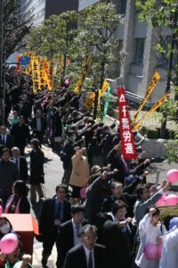 最後に林家木久扇さんが再びマイクを握り、「08春闘の勝利に向けてみなさんがんばっていただきたいと思います」と呼びかけ、「春闘」でなぞかけ。