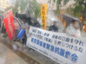 全教と教組共闘連絡会・子ども全国センター・民主教育研究所は、8月4日に衆議院第2議員会館前で、安倍元首相の「国葬」実施を閣議決定したことに抗議し、その中止を求める教育関係者による緊急集会をおこない、強い雨のなか約70人が参加しました。